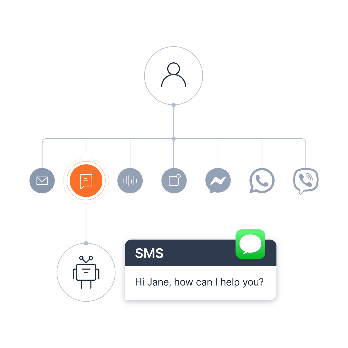 Use pre-built or custom integrations with options to keep using your existing carrier or chatbot. Share insights across multiple systems for a complete 360-degree customer view.