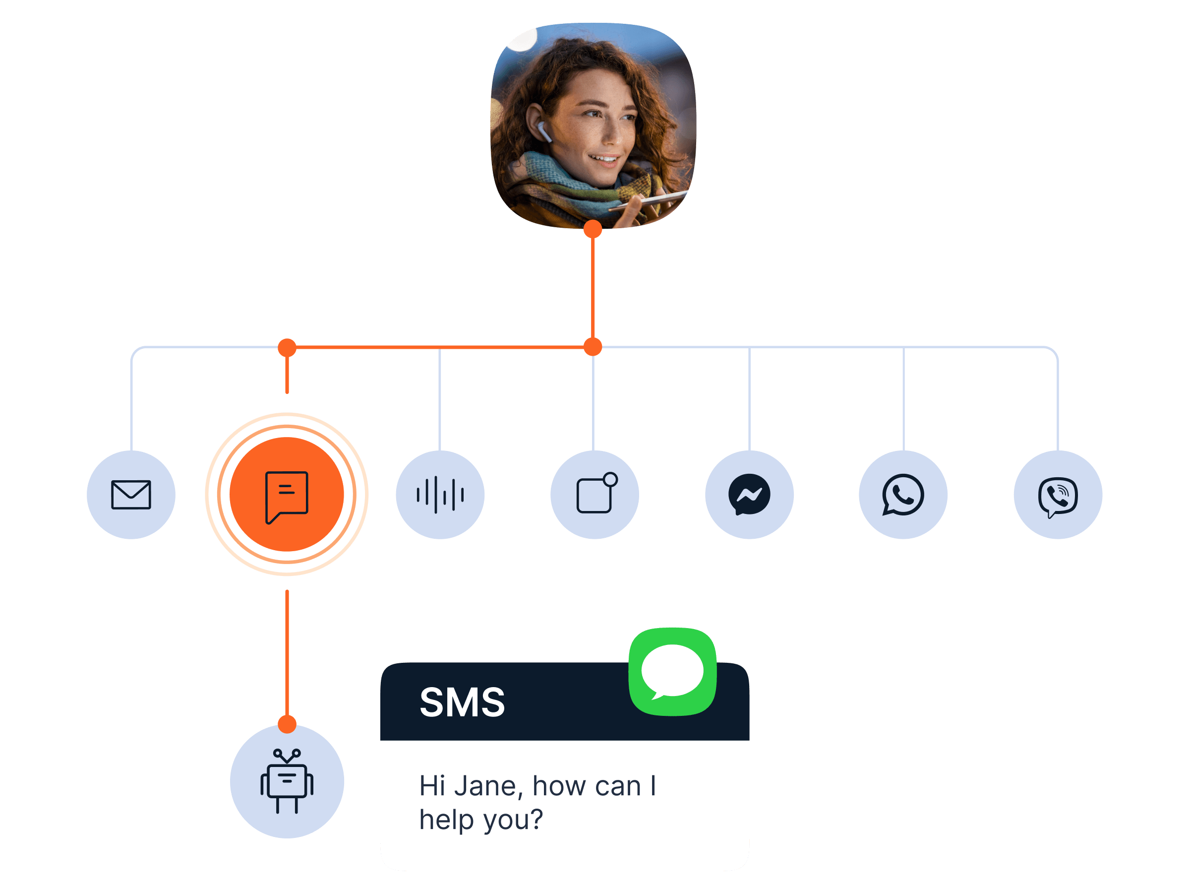 Use pre-built or custom integrations with options to keep using your existing carrier or chatbot. Share insights across multiple systems for a complete 360-degree customer view.